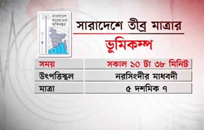 আজ শুক্রবার (২১ নভেম্বর, ২০২৫) সকাল ১০টা ৩৮ মিনিটে রাজধানী ঢাকাসহ দেশের বিভিন্ন অঞ্চলে ভূমিকম্প অনুভূত হয়। আবহাওয়া অধিদপ্তরের তথ্য অনুযায়ী, ভূমিকম্পটির উৎপত্তিস্থল ছিল