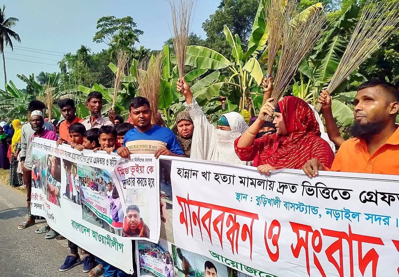নড়াইল সদর উপজেলার বুড়িখালি গ্রামের দরিদ্র ভ্যানচালক হান্নান খান (৬০) হত্যা মামলার আসামিদের দ্রুত গ্রেফতারের দাবিতে বিক্ষোভ মিছিল ও মানববন্ধন অনুষ্ঠিত হয়েছে। এলাকাবাসী ও ভুক্তভোগী পরিবারের উদ্যোগে আজ, রোববার (৭ ডিসেম্বর) দুপুরে বুড়িখালি বাসস্ট্যান্ড এলাকায় এই কর্মসূচি পালিত হয়।