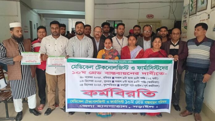 বুধবার (৩ ডিসেম্বর) সকাল ৯টা থেকে শুরু হয়ে দুপুর ১২টা পর্যন্ত মোট ৩ ঘণ্টা নড়াইল সদর হাসপাতাল চত্বরে এই কর্মবিরতি চলে। ‘মেডিকেল টেকনোলজিস্ট ও ফার্মাসিস্ট ১০ম গ্রেড বাস্তবায়ন পরিষদ’-এর ব্যানারে আন্দোলনকারীরা হাসপাতালের অভ্যন্তরে অবস্থান নিয়ে কর্মবিরতি পালন করেন। মানবসেবার স্বার্থে জরুরি স্বাস্থ্যসেবা সীমিত আকারে চালু রাখা হলেও অন্যান্য কার্যক্রম বন্ধ ছিল। সংক্ষিপ্ত বক্তব্যে মেডিকেল টেকনোলজিস্ট ও ফার্মাসিস্ট নেতারা দীর্ঘদিনের বেতন বৈষম্যের শিকার হওয়ার অভিযোগ তুলেছেন। বক্তারা দীর্ঘদিন ধরে অর্থাৎ ১৯৮৯ সাল থেকে এই ন্যায্য দাবি জানিয়ে আসছেন। একই যোগ্যতার অধিকারী অন্য ডিপ্লোমাধারীরা, যেমন— ডিপ্লোমা প্রকৌশলীরা (১৯৯৪), ডিপ্লোমা নার্সরা (২০১১) এবং ডিপ্লোমা কৃষিবিদরা (২০১৮) ইতোমধ্যে ১০ম গ্রেডের মর্যাদা পেলেও ডিপ্লোমা মেডিকেল টেকনোলজিস্ট ও ফার্মাসিস্টরা এখনো ১১তম গ্রেডেই রয়ে গেছেন। করোনা, ডেঙ্গু ও চিকুনগুনিয়ার মতো মহামারীতেও এই পেশার সদস্যরা জীবন ঝুঁকি নিয়ে দায়িত্ব পালন করেছেন এবং রোগ নির্ণয়, প্যাথলজি, রেডিওলজি, ইমেজিং এবং ওষুধ ব্যবস্থাপনায় গুরুত্বপূর্ণ ভূমিকা রাখেন।